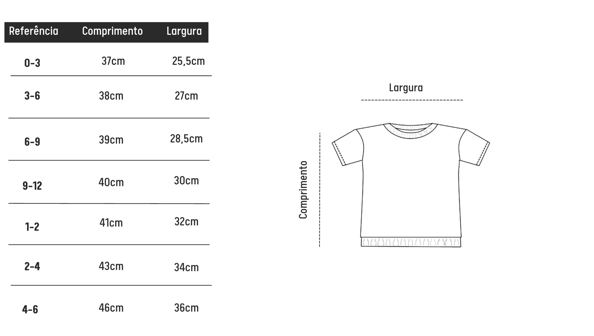 Disponível em uma ampla faixa de tamanhos, desde 0-3 meses até 4-6 anos, você pode escolher a camiseta que melhor se ajusta ao crescimento do seu pequeno(a). A qualidade do material garante durabilidade, permitindo que ele(a) aproveite a camiseta por muito tempo.